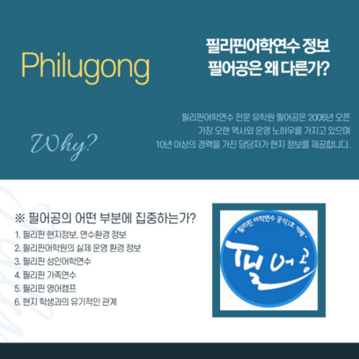 2006년부터 커뮤니티 기반으로 필리핀어학연수 정보를 축적해온 필어공은 검증된 후기와 실제 데이터를 바탕으로 어학원추천 서비스를 제공한다.