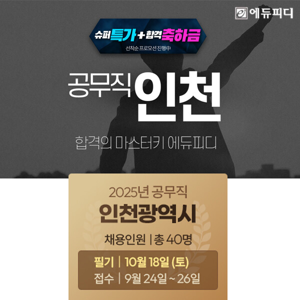 에듀피디는 2025년 하반기 인천시 공무직 공개채용 시험에 맞춰 ‘일반상식(정치, 경제, 법, 문화 등 사회 전반, 환경상식 포함)+인천시 전용 윤리+한국사/사회(단기속성)특강’으로 기획된 ‘이론+문제풀이’ 구성의 ‘단기속성 합격패키지’ 강좌를 '30일 속성 과정'으로 오픈하고 짧은 기간 최적의 학습 효과를 끌어낼 수 있는 전문 강좌 커리큘럼을 선보인다.