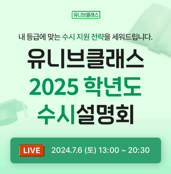 [피앤피뉴스=마성배 기자] 학부모와 학생을 위한 입시 솔루션을 제공하는 유니브클래스가 오는 7월 6일 토요일 오후 1시부터 약 7시간 동안 2025학년도 수시 입시 설명회를 개최한다.