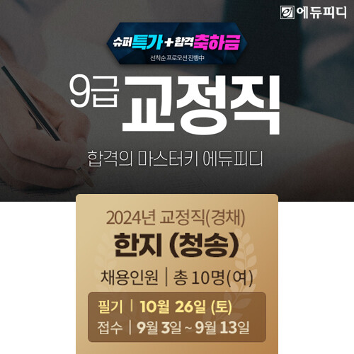 이에 에듀피디는 교정직 9급 경채 필기 시험에 대비할 수 있는 ‘이론+문제풀이+기출해설특강’ 구성의 ‘합격패키지’ 강좌를 속성 과정으로 기획해 짧은 기간 고효율 압축 학습으로 목표 점수를 공략하는 학습 전략을 제시한다는 방침이다.
