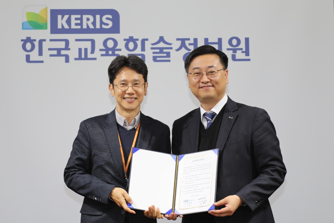 노사 공동선언문 채택 사진(왼쪽부터 한국교육학술정보원 정진명 노동조합 지부장, 한국교육학술정보원 정제영 원장)