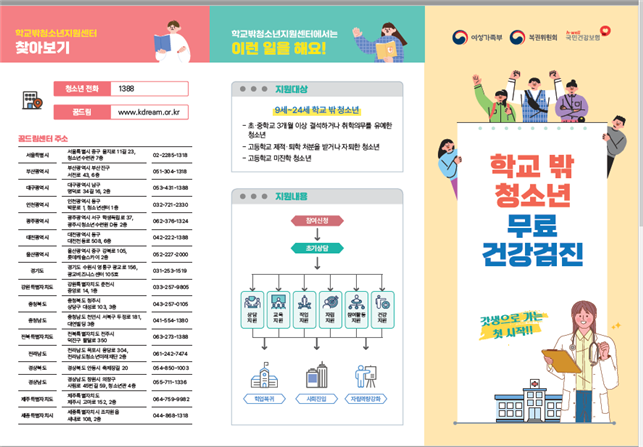 여가부는 국민건강보험공단과 협조해 홍보 포스터(1,544부), 리플릿(54,300매)을 제작해 꿈드림센터, 청소년쉼터, 대안교육기관 등 635개 기관에 배포했다.