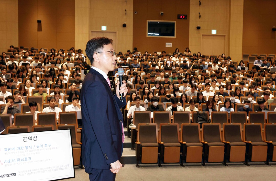 ▲연원정 인사혁신처장이 지난 5월19일 충북 진천군 국가공무원인재개발원에서 신임관리자과정 교육생을 대상으로 '여러분의 꿈으로 바꾸는 공직의 미래' 특강을 하고 있다.