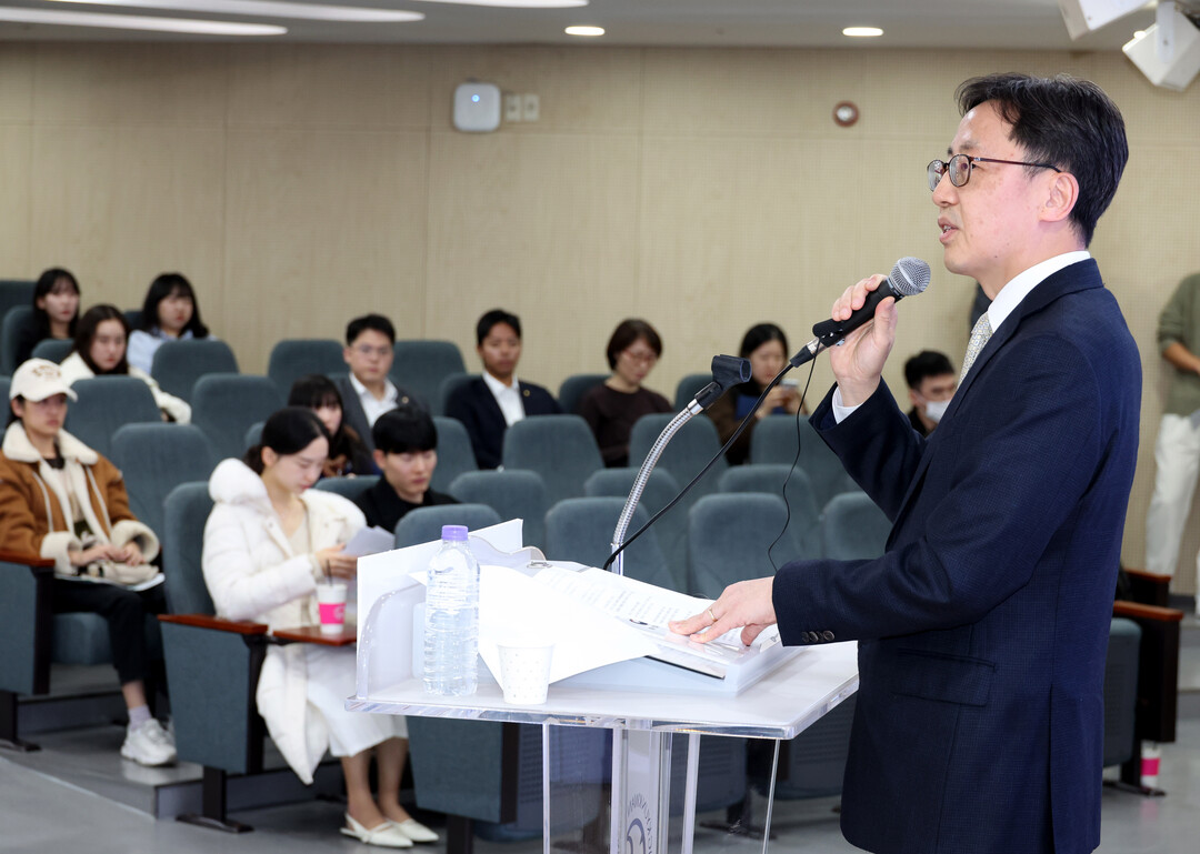 <연원정 인사혁신처장이 18일 '2024 찾아가는 공직박람회'가 열린 서울 종로구 성균관대학교를 방문, 재학생들과 간담회를 갖고 공직 소개 및 공직자의 역할 등에 대해 설명하고 있다.>