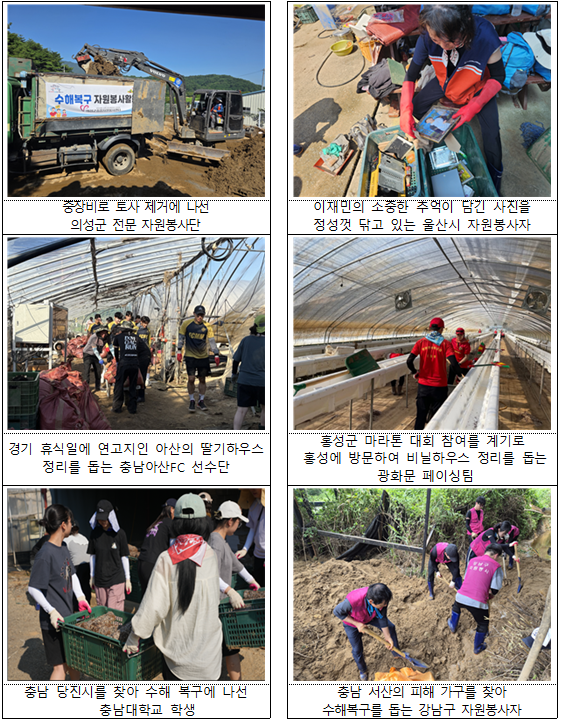 또한, 충남아산FC 선수단은 경기 휴식일이던 7월 27일, 연고지인 충남 아산의 피해 딸기 하우스 농가를 자발적으로 복구하고, 선수들이 개별 기부도 함께 진행했다. 광화문 페이싱팀이라는 마라톤 동호회는 회원 20여 명이 충남 홍성을 찾아 비닐하우스 정리에 참여하며 “달리는 마음으로 달려왔다”는 메시지를 전했다.