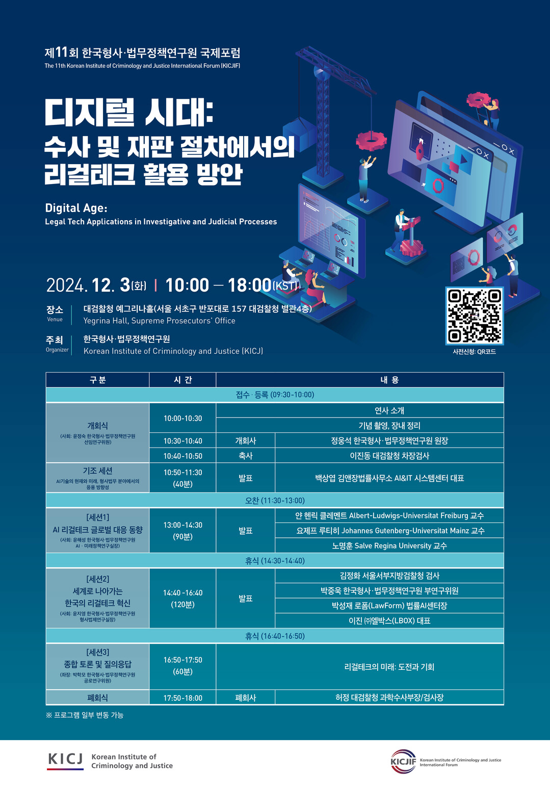 한국형사·법무정책연구원(원장 정웅석)은 오는 12월 3일 대검찰청 예그리나홀에서 ‘디지털 시대: 수사 및 재판 절차에서의 리걸테크 활용 방안’을 주제로 제11회 국제포럼을 개최한다고 밝혔다.