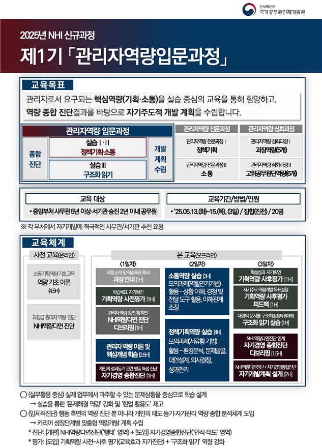 [피앤피뉴스=마성배 기자] 행정의 중간 허리를 책임질 ‘차세대 공직 리더’를 위한 맞춤형 훈련이 새롭게 출범한다. 국가공무원인재개발원은 4급 승진을 앞둔 중앙부처 중간관리자를 대상으로 ‘관리자역량 입문과정’을 신설하고, 오는 5월 13일부터 본격 운영에 들어간다고 7일 밝혔다.