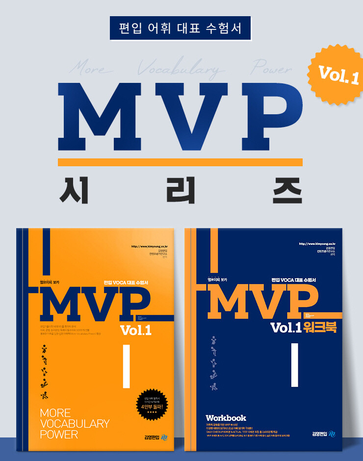 앞서 출간되었던 MVP Vol.1은 판매 4만부를 돌파하며 명실상부한 대학편입 어휘 대표 수험서로 자리잡았다. MVP Vol.1은 어휘, 문법, 논리, 독해에 필요한 편입 영어 필수 어휘 3,000개를 선별해 수록하고 있다. DAY별 구성으로 표제어를 60일 동안 암기할 수 있도록 구성해, 총 3,000개의 표제어를 익힐 수 있다.