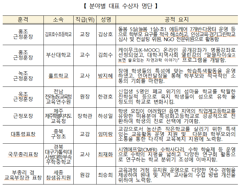 스승늬 날 기념식 정부포상 및 표창에는 근정훈장 17명, 근정포장 17명, 대통령표창 95명, 국무총리표창 109명, 장관 표창 2,953명이 수상자로 선정됐다.