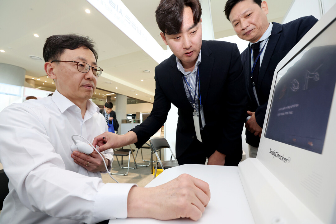 ▲연원정 인사혁신처장이 16일 세종시 정부세종청사에서 열린 '찾아가는 건강주간' 행사에 참석해 스마트 헬스 진단케어 체험을 하고 있다.