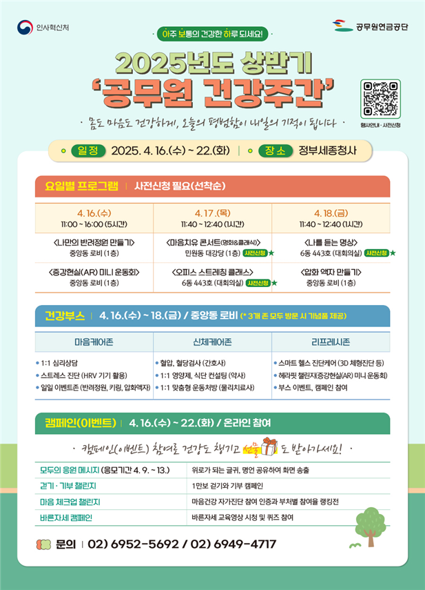 [피앤피뉴스=마성배 기자] 공무원들의 심신 회복과 건강한 공직문화 확산을 위한 ‘찾아가는 건강주간’ 행사가 4월 16일부터 22일까지 전국 정부청사 10곳에서 동시에 열린다. 행사는 인사혁신처와 공무원연금공단이 공동 주최하며, 올해는 ‘아보하(아주 보통의 건강한 하루)’를 주제로 자기돌봄 문화를 체험 중심으로 확산시키는 데 초점을 맞췄다.
