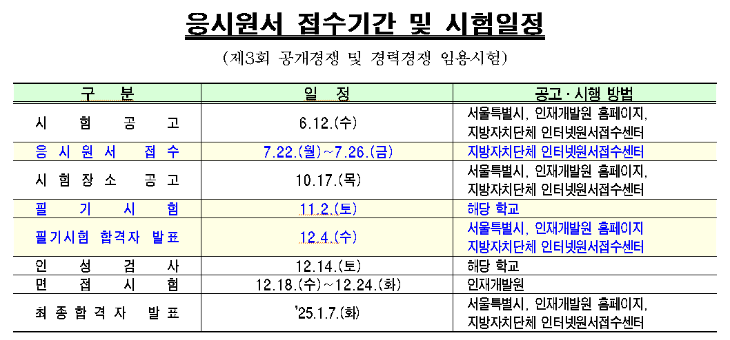 필기시험은 타 시도와 동일하게 11월 2일(토)에 실시하고 필기시험 합격자 발표는 12월 4일(수)이다. 인성검사는 12월 14일(토), 마지막 면접시험은 12월 18일부터 24일까지 인재개발원에서 진행한 후 내년(2025년) 1월 7일(화)에 최종합격자를 발표할 예정이다.