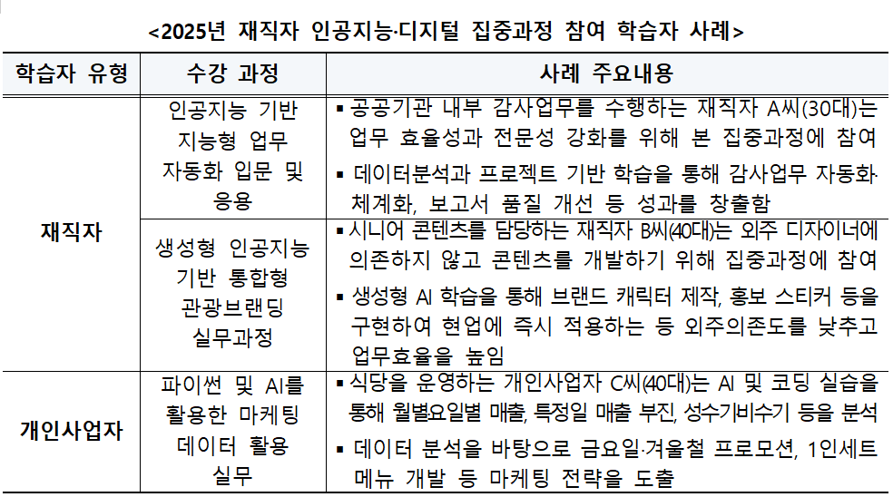 지난해에는 총 30개 대학이 참여해 영업, 교육, 금융, 건축·설계, 제조업 등 다양한 산업 분야를 아우르는 교육과정을 운영했고, 1만1,683명의 학습자가 참여했다. 교육 이수자들은 업무 자동화와 체계화, 사업 홍보 전략 수립 등 실질적인 직무 성과를 창출한 것으로 나타났다.