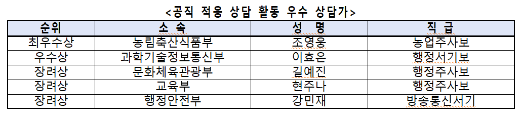 우수상은 과학기술정보통신부 이효은 주무관이 수상했으며, 장려상은 문화체육관광부 길예진 주무관, 교육부 현주나 주무관, 행정안전부 강민재 주무관이 각각 수상의 영예를 안았다. 이들은 직렬별 업무 궁금증, 조직문화 적응법, 악성 민원 대응과 스트레스 관리법 등 실질적인 상담으로 큰 호평을 받았다.