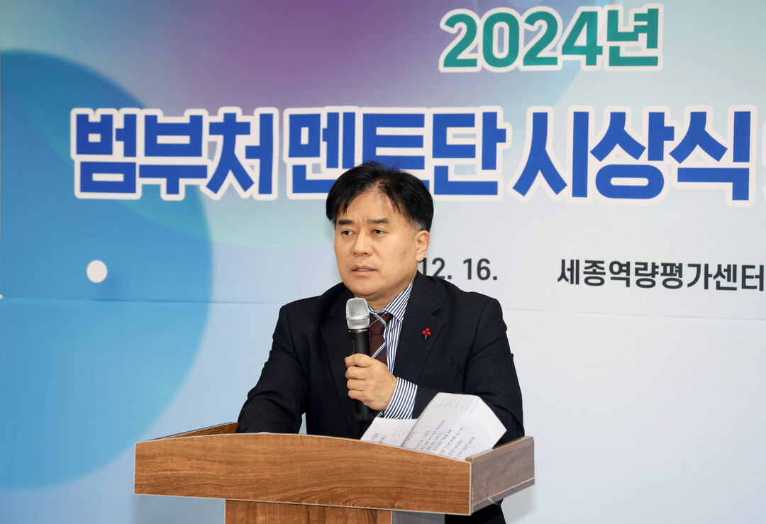 <박용수 인사혁신처 차장이 16일 세종시 역량평가세종센터에서 열린 '2024년 범부처 멘토단 시상식 및 워크숍'에서 인사말을 하고 있다.>