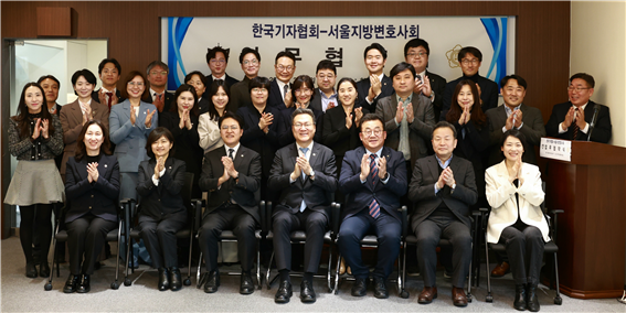 서울지방변호사회는 5일 오전 11시 30분 서울 중구 한국프레스센터 13층 한국기자협회 회의실에서 한국기자협회와 법률 및 언론 분야 협력 강화를 위한 업무협약(MOU)을 체결했다고 밝혔다. 협약식에는 조순열 서울지방변호사회 회장과 김기원 수석부회장 등 변호사회 임원진, 박종현 한국기자협회 회장과 곽수근 부회장 등 양 기관 관계자 30여 명이 참석했다.