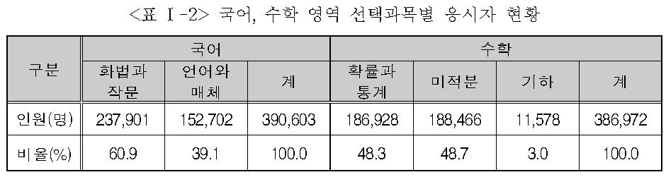 국어 영역에서는 화법과 작문을 선택한 비율이 60.9%, 언어와 매체를 선택한 비율이 39.1%였다.