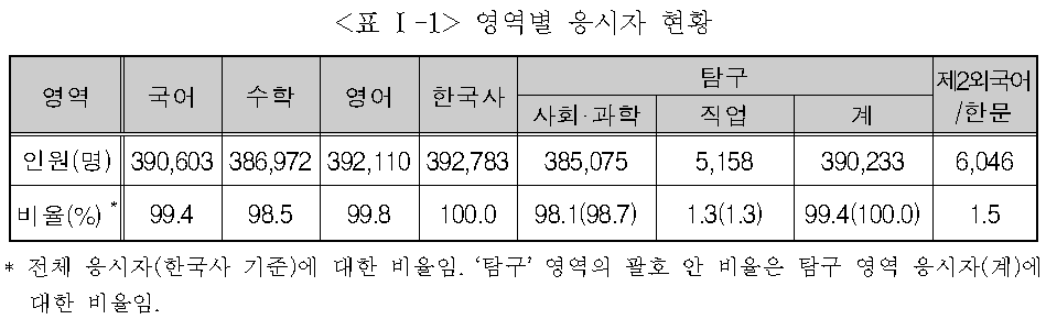 특히 사회·과학탐구 영역의 응시자 중 사회탐구만 응시한 수험생은 193,533명, 과학탐구만 응시한 수험생은 157,245명, 두 영역을 조합해 응시한 수험생은 34,297명이었으며, 응시자의 대부분(99.4%)이 2개 과목에 응시했다.