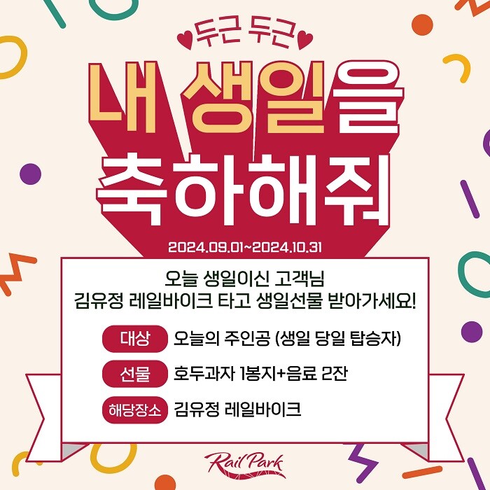 한편, 강촌레일파크는 오는 10월까지 생일 당일에 김유정레일바이크를 탑승하는 방문객을 대상으로 특별한 이벤트를 진행한다. 생일을 맞은 방문객에게 호두과자와 음료 2잔이 무료로 제공되며, 이를 통해 방문객의 만족도를 높이겠다고 전했다.