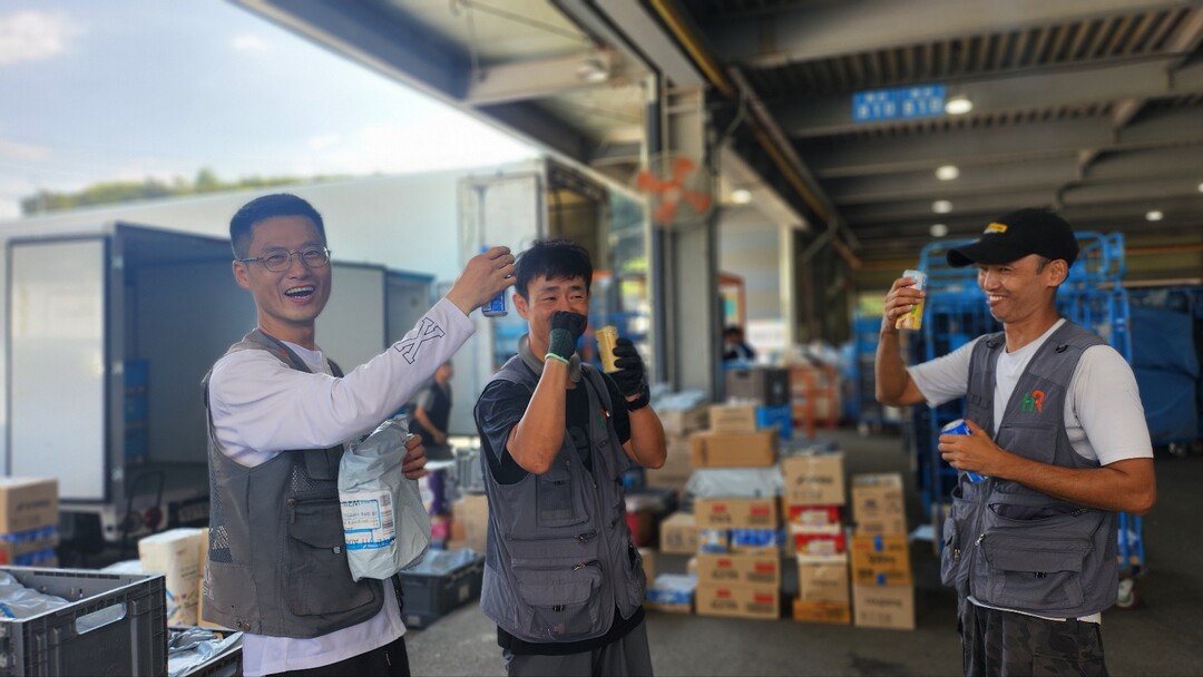 [아산 캠프 에이치알그룹 배송기사들이 음료수를 마시며 즐거워하고 있다. / 에이치알그룹 미디어팀 제공]