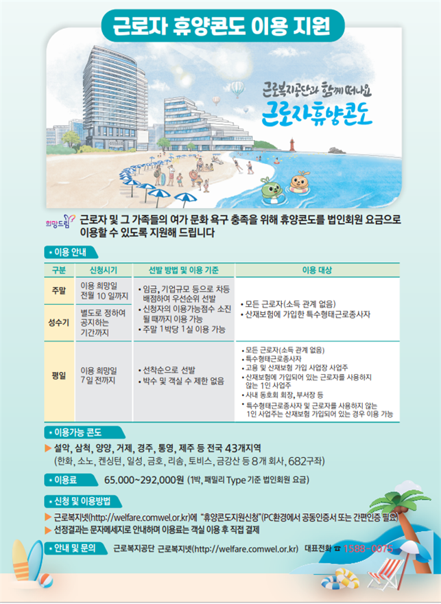 지원 대상은 상시근로자는 물론, 택배기사, 퀵서비스기사 등 노무제공자까지 포함된다. 이들은 여름 성수기인 7월 18일부터 8월 23일까지 기간 중 콘도를 1박 기준 6만 5천원에서 최대 29만 2천원의 할인 요금으로 이용할 수 있다.