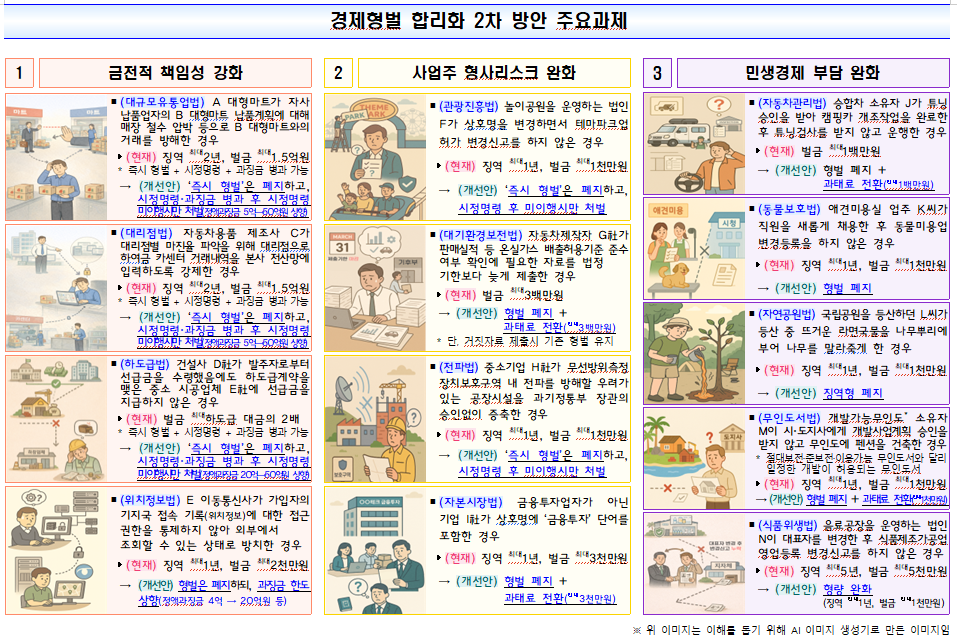 이번 방안은 지난 9월 30일 발표한 1차 방안에서 110개 경제형벌을 정비한 데 이은 후속 대책으로, 과도한 형벌 규정이 민간의 경제활동을 위축시키고 국민 생활에 부담을 준다는 문제의식에서 출발했다. 형벌 우선 관행에도 불구하고 불공정 거래 등 기업의 중대 위법행위가 반복되고 있다는 점을 고려해, 형벌보다는 경제적 제재를 통한 실효적 억제에 정책의 무게를 실었다.