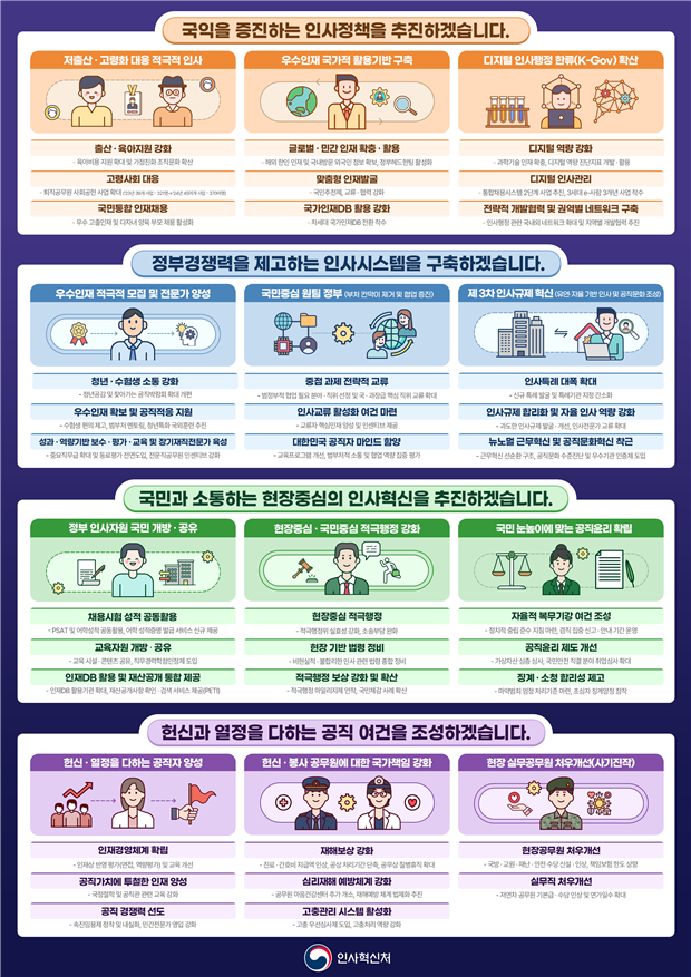 공직사회의 우수인재 확보를 위해 해외(글로벌)·민간 인재를 확충하고, 맞춤형 인재발굴 및 국가인재데이터베이스 활성화를 통해 범정부적 차원의 인재 활용을 적극 지원한다.
