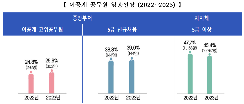 [피앤피뉴스=마성배 기자] 정부가 중앙부처와 지방자치단체의 여성 고위직과 관리자 비율이 꾸준히 증가해 5년 연속 임용 목표를 초과 달성했다고 밝혔다. 또한 이공계 공무원, 장애인 고용, 지역 인재 채용 등 공공부문에서 인적 다양성이 전반적으로 확대되고 있는 것으로 나타났다.