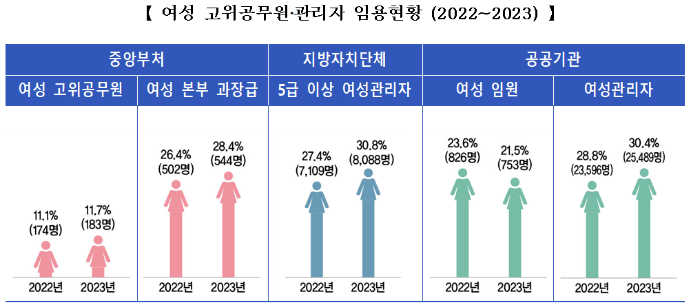 중앙부처와 지방자치단체는 2019년 이후 5년 연속으로 '공공부문 성별 대표성 제고 계획'에 따른 여성 관리자 임용 목표를 초과 달성했다.