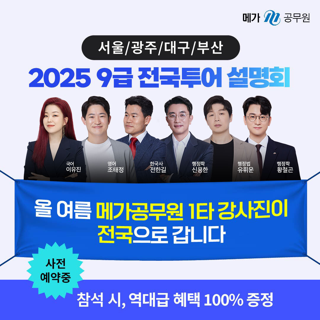 [피앤피뉴스=마성배 기자] 메가스터디교육이 운영하는 공무원시험 전문 브랜드 메가공무원이 2025년 9급 공무원 시험을 대비하여 1타 강사진이 직접 찾아가는 전국 설명회를 최초로 개최한다고 밝혔다.