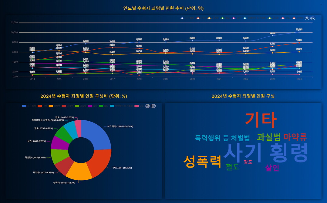 서비스에 포함된 시각화 항목은 월간 통계와 연간 통계로 나뉜다. 월별로는 △전체 수용자 현황 △연령대별 분포 △교정기관 입·출소 통계 △소년·노인·여성 수용자 수 △마약·조직폭력·정신질환 관련 수용자 통계 △접견·심리치료·상담·출정 현황 등 교정현장을 입체적으로 보여주는 자료들이 포함됐다.
