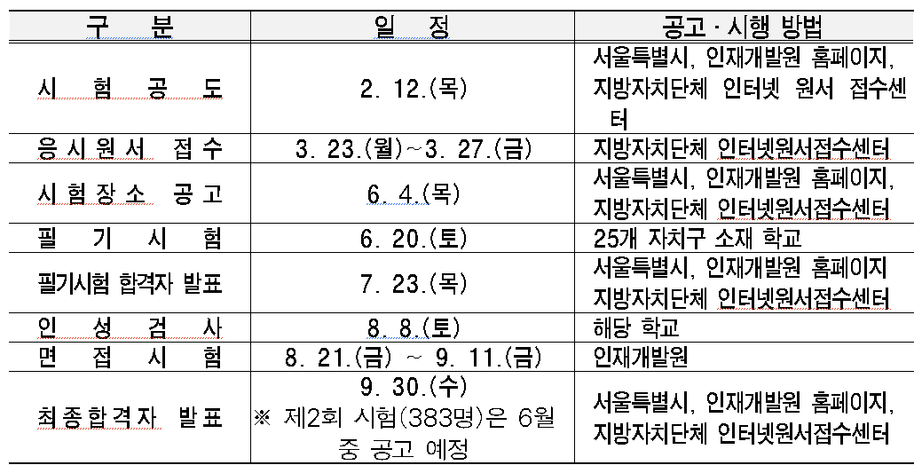 한편 시험 일정과 직렬별 세부 선발 인원, 응시 자격 등 자세한 사항은 서울시 인재개발원 홈페이지와 지방자치단체 인터넷원서접수센터를 통해 확인할 수 있다.