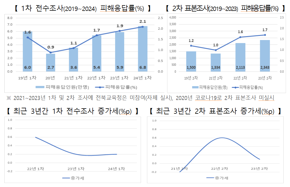 피해응답률은 2024년 1차 전수조사에서 2.1%, 2023년 2차 표본조사에서 1.7%로 나타났으며, 증가세가 다소 둔화된 양상을 보였다.