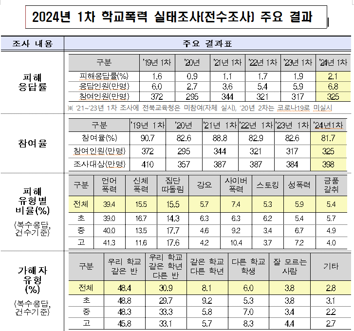 교육부(부총리 겸 교육부 장관 이주호)는 26일 17개 시도교육청이 실시한 ‘2024년 1차 학교폭력 실태조사’와 ‘2023년 2차 학교폭력 실태조사’ 결과를 발표했다.