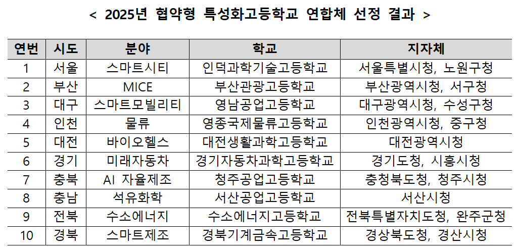 이번 공모에는 전국 15개 지역에서 37개의 연합체가 신청했으며, 교육부는 산업계와 지역 전문가 등으로 구성된 선정심사위원회의 서면 및 대면 평가를 거쳐 10개 지역 10개교를 협약형 특성화고로 선정했다. 해당 학교들은 2025년 하반기까지 학과 개편, 교육과정 개발, 교원 연수 등 준비를 마치고, 2026학년도부터 신입생을 모집할 계획이다.