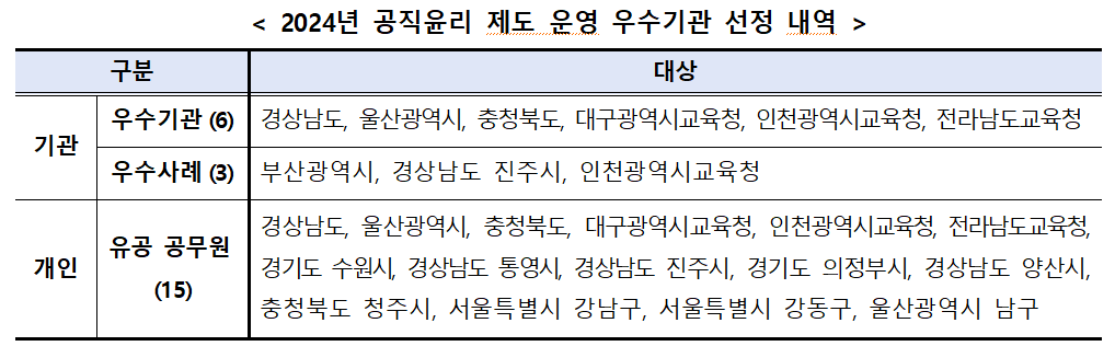 공직윤리 업무에 기여한 공로로 경남도의 백선희 주무관, 울산시의 이재진 주무관, 충북도의 김도현 주무관 등 15명이 업무유공자로 선정됐다. 이들은 재산등록과 취업제한 제도를 성실히 운영하며 공직사회의 신뢰도를 높이는 데 일조했다.