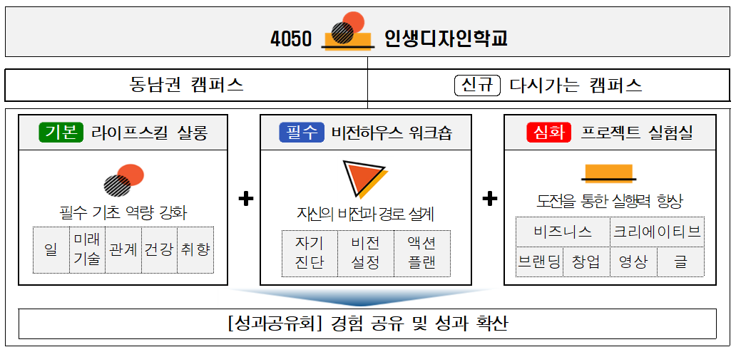 교육은 ▲자기 진단과 역량 강화 중심의 ‘라이프스킬 살롱’ ▲비전 수립과 액션 플랜을 설계하는 ‘비전하우스 워크숍’ ▲구체적인 도전과 실행을 위한 ‘프로젝트 실험실’의 3단계로 진행된다. 과정별로 창업, 브랜딩, 글쓰기, 영상 제작 등 다양한 분야에서 실전 프로젝트를 수행할 수 있도록 지원한다.
