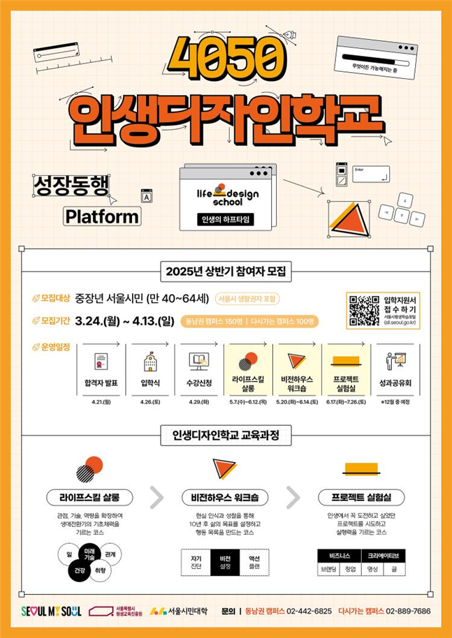 한용진 서울시평생교육진흥원장은 “인생디자인학교는 단순한 강좌가 아니라, 삶을 전환하고 새롭게 설계할 수 있는 플랫폼”이라며 “중장년이 교육을 통해 다시 한 번 도약할 수 있도록 다양한 기회를 열어가겠다”고 말했다.