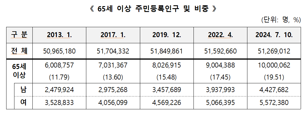 우리나라 65세 이상 주민등록인구가 7월 10일 기준으로 1,000만 명을 넘어섰다. 이는 전체 인구의 19.51%를 차지해 초고령화 사회 진입을 목전에 두고 있다.