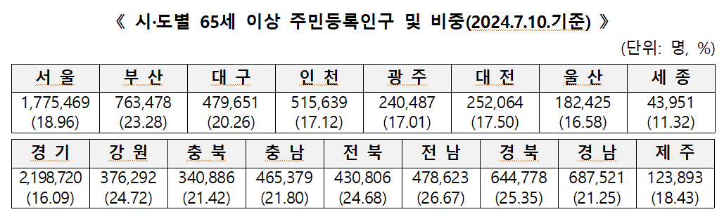 65세 이상 주민등록인구가 가장 많이 거주하는 지역은 전남으로 26.67%로 가장 높았으며, 경북, 강원, 전북, 부산, 충남, 충북, 경남, 대구 순으로 나타났다. 65세 이상 비중이 가장 낮은 지역은 세종으로 11.32%였다.