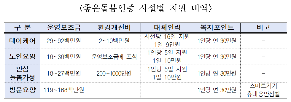 노인요양시설은 1,600만원~3,600만원, 안심돌봄가정은 1,800만원~2,700만원의 보조금과 함께 종사자 1인당 복지포인트 30만원, 대체인력 5일분이 별도로 지원된다.