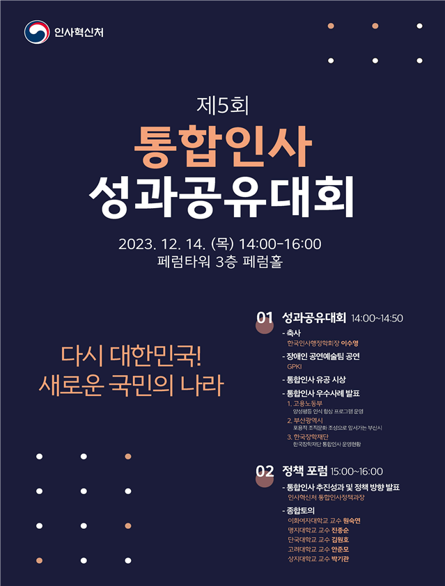 [피앤피뉴스=마성배 기자] 인사혁신처(처장 김승호)는 14일 서울 페럼타워에서 중앙부처, 지방자치단체, 공공기관 등이 참여하는 ‘제5회 통합인사 성과공유대회’를 개최했다고 밝혔다.