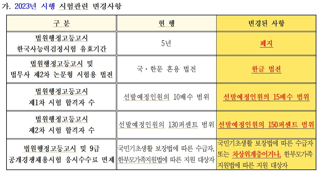 지난 2023년부터 시행되고 있는 변경사항으로는 법원행시의 한국사 과목을 대체하는 한국사능력검정시험 5년의 성적 인정기간을 폐지했다.