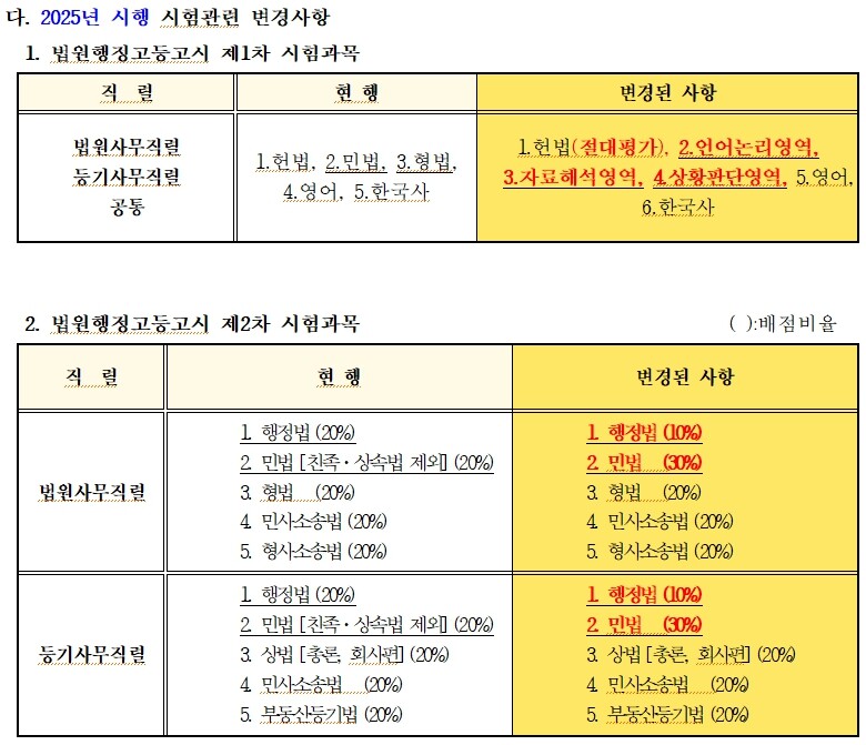 마지막으로 2025년부터는 법원행시 1차 시험에서 기존 과목인 민법과 형법을 폐지하고 공직적격성평가(PSAT)를 도입하며, 헌법을 절대평가로 변경한다.