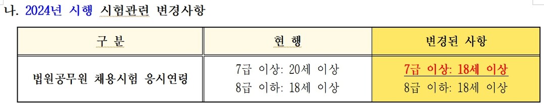 금년 2024년부터 7급 이상 법원공무원 채용시험 응시연령을 20세 이상에서 ‘18세 이상’으로 하향되면서 고등학생도 7급 법원공무원이 될 수 있다.