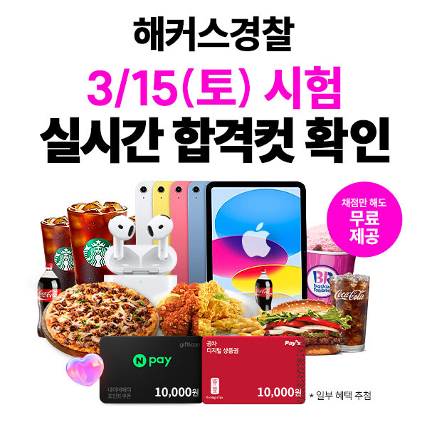 이와 함께 해커스경찰은 시험을 본 경시생들을 위한 다양한 이벤트도 제공하고 있다. 채점 시 경찰 면접강의 30% 할인쿠폰과 경찰 승진패스 10만 원 할인쿠폰을 제공하고 있으며, 경찰 필기시험 당일인 3월 15일(토)부터 경찰 필기 합격 발표일인 3월 21일(금)까지 날짜별로 채점한 인원 중 추첨을 통해 매일 푸짐한 경품 혜택도 제공하고 있다.