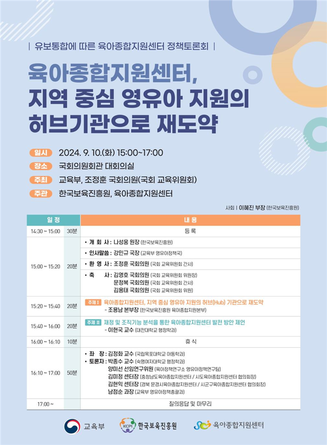 이번 토론회에서는 육아종합지원센터의 역할을 재정립하고, 유보통합에 따른 효율적인 운영 방안을 모색하기 위해 전문가들이 다양한 의견을 나눴다.