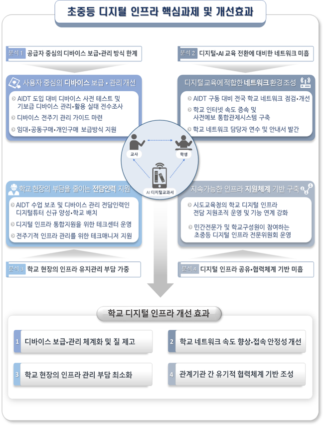 이번 ‘초·중등 디지털 인프라 개선계획’은 학교 현장과 인프라 관리 부담을 줄이고, 인공지능 디지털교과서 도입에 맞춰 교육 환경을 혁신하는 데 중점을 두고 있다.