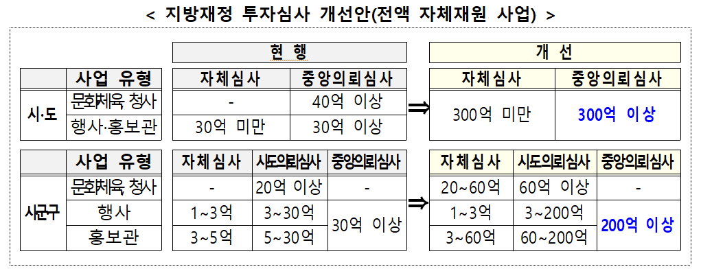 아울러 지방의 자율성을 강화하기 위한 방안도 논의됐다. 지자체가 스스로 사업 타당성을 심사할 수 있도록 문화·체육시설, 청사 신축 등 사업에 대한 자체심사 범위를 확대하고, 소규모 우발채무 사업에 대한 상급심사 의무를 면제하는 방안을 발표했다.