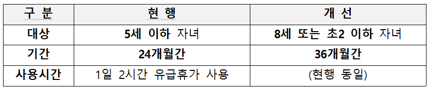 개정안에는 하루 최대 2시간까지 사용 가능한 육아시간의 대상 자녀를 5세 이하에서 8세 또는 초등학교 2학년 이하까지 확대한다. 또한 사용기간도 기존 2년(24개월)에서 3년(36개월)으로 1년 더 늘린다.